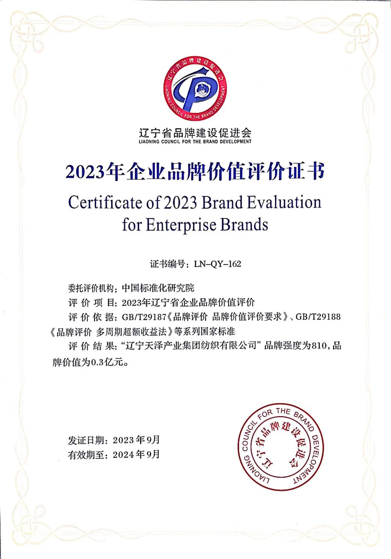 遼寧天澤紡織公司榮獲2023年企業品牌價值評價證書